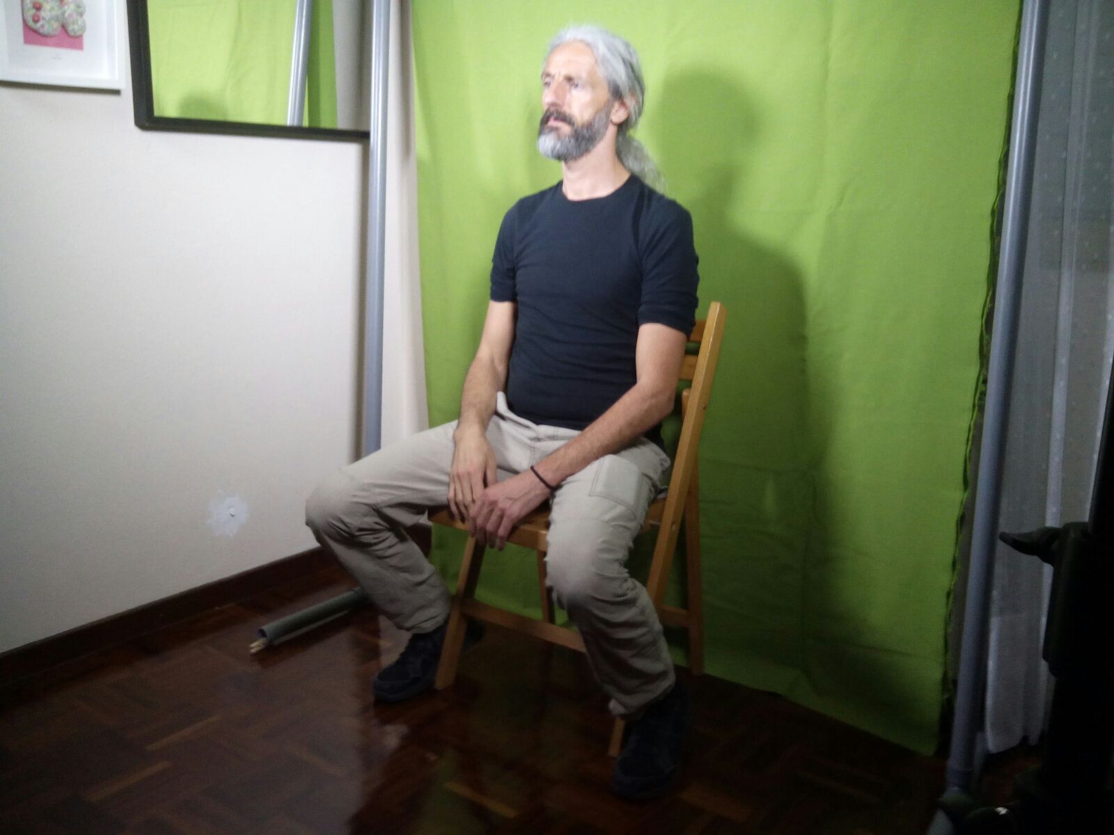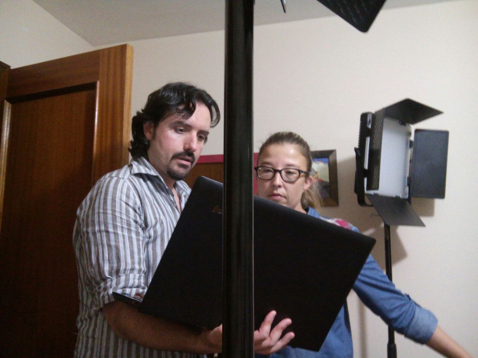 ![]() Revisando los planos grabados sin La Sombra para reproducir la angulación de cámara y la posición del actor que la va a interpretar frente a la croma. Foto de Juan José Bors. |